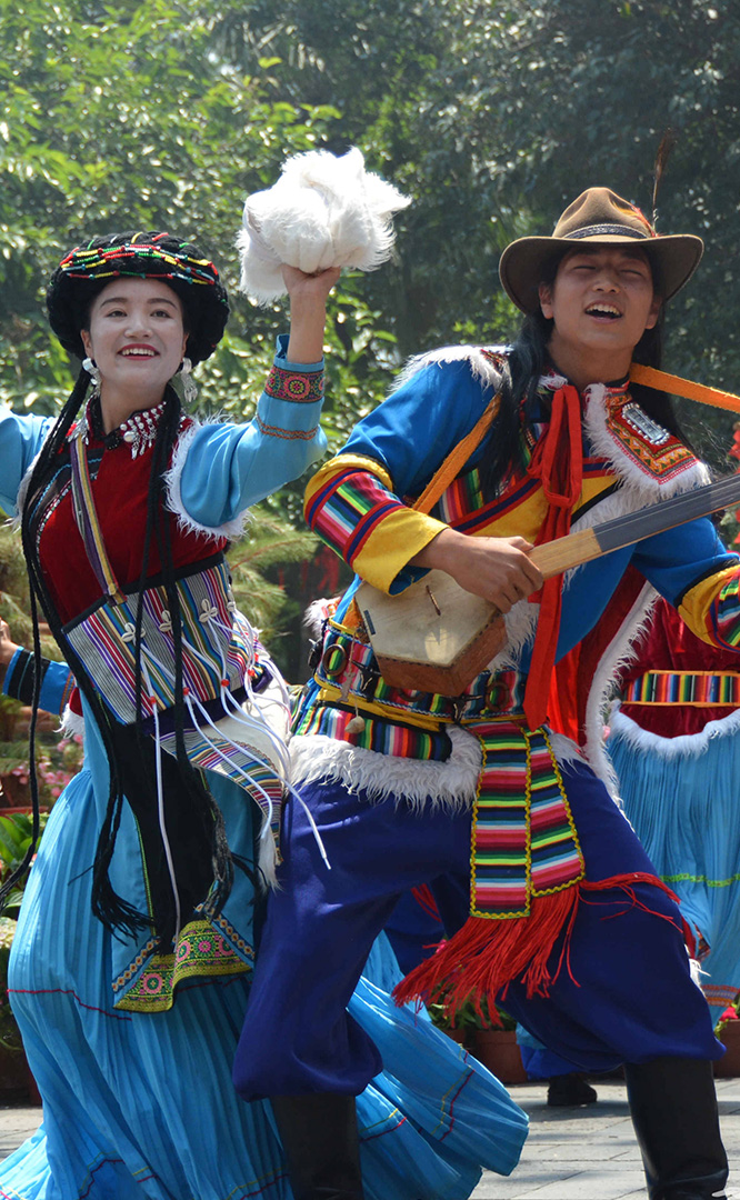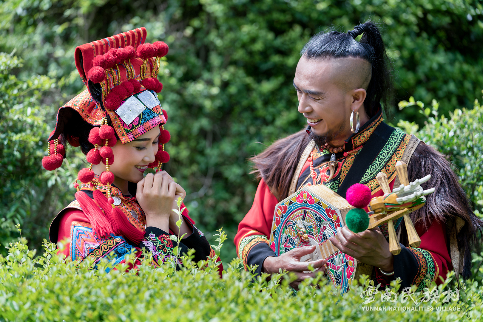 彝族在云南境內(nèi)約471萬人,是省內(nèi)人口最多、分布最廣的少數(shù)民族,主要聚居在金沙江、元江流域和哀牢山、無量山腹地。彝族是一個能歌善舞的民族,民間打歌、跳樂之風(fēng)盛行,大三弦、跌腳舞久負(fù)盛名。火把節(jié)是彝族最具特色的民族節(jié)日。彝族村占地50余畝,三虎浮雕墻與虎頭內(nèi)祖師形象表現(xiàn)了彝族虎鷹文化。太陽歷廣場圖騰柱上有太陽、虎、火和八卦圖形象,周圍環(huán)繞著10個朝向不同的月球造型,外圓周有12生肖石雕。依山而建的“...